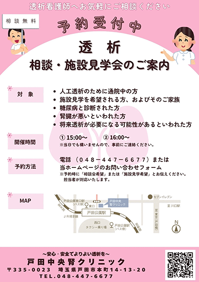 透析看護師がご案内いたします! 相談・施設見学会のご予約は、電話(048-447-6677)またはお問い合わせフォームからお願いします。 -
